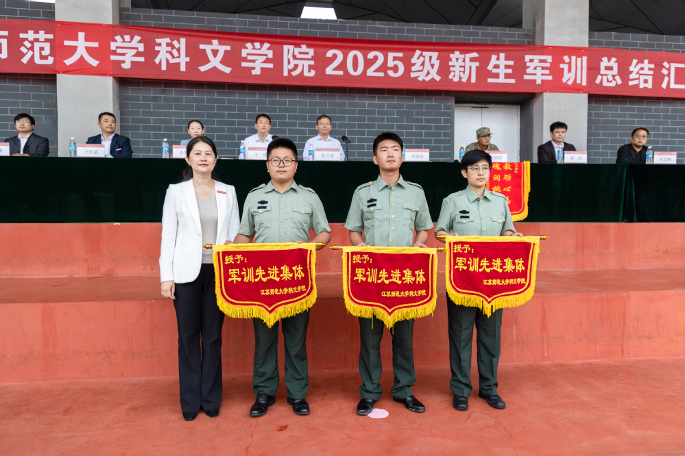 王健宣读《关于表彰2025年军训工作先进集体和个人的决定》。刘晓莲分别为受表彰的军训先进集体、标兵营、军训优秀辅导员和军训优秀学员代表颁奖。