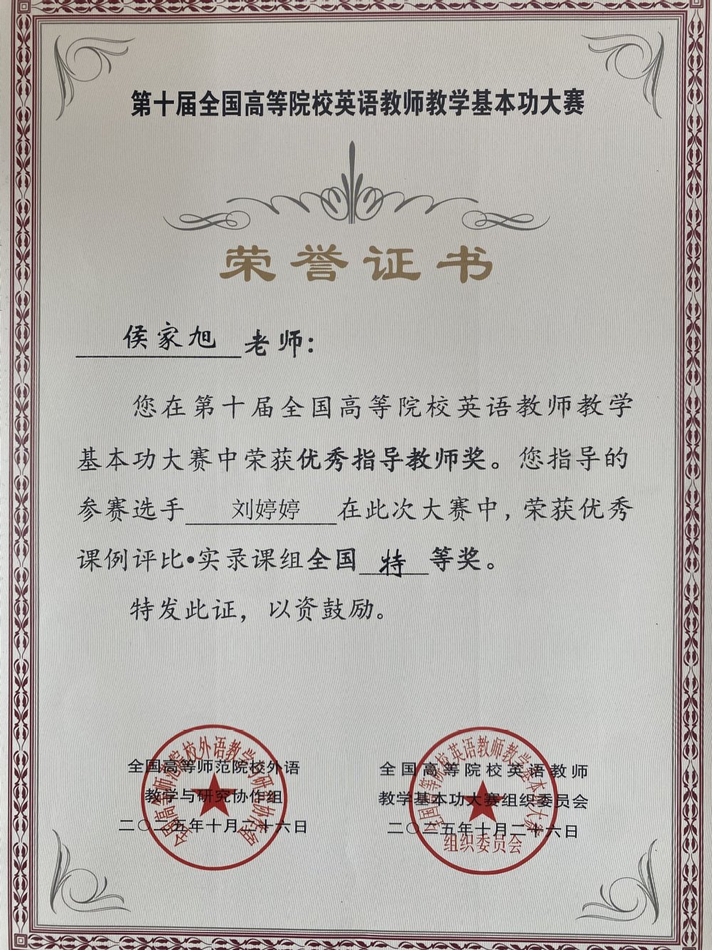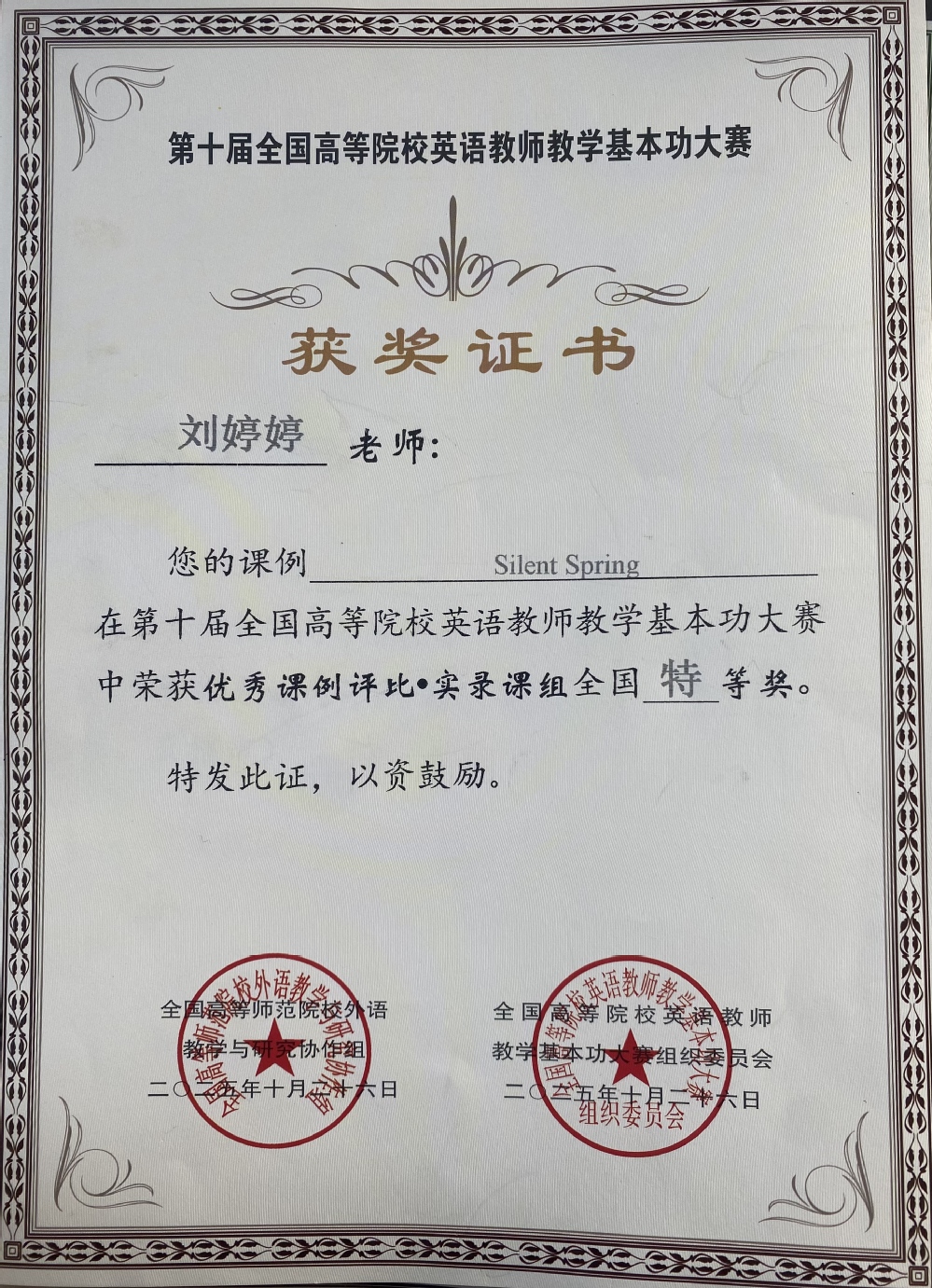 10月23日—10月26日,第十届全国高等院校英语教师教学基本功大赛全国总决赛在南京理工大学举行。我院刘婷婷老师斩获优秀课例评比·实录课组全国特等奖、最佳教学设计奖。