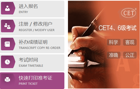 登录全国大学英语四、六级报名网(http://cet-bm.neea.edu.cn/),使用报名时的用户名和密码进入个人账户中打印,也可直接点击主页面中“快速打印准考证”进行打印。