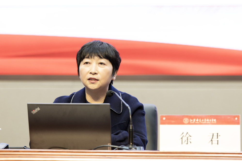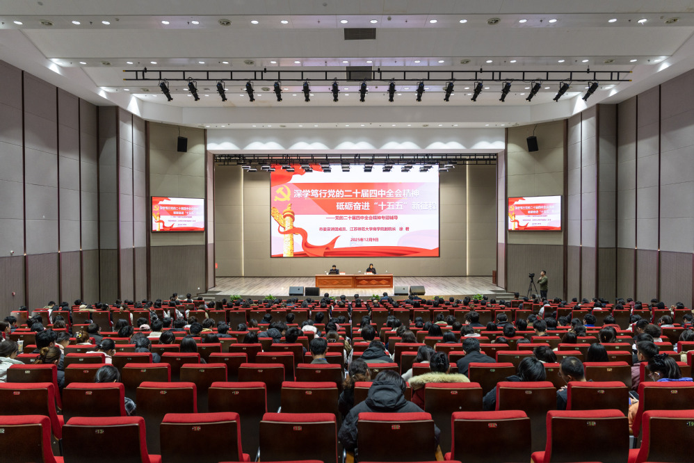 12月9日下午,学院在明志报告厅举行学习贯彻党的二十届四中全会精神市委宣讲团报告会,市委宣讲团成员、江苏师范大学商学院副院长徐君教授作宣讲报告。院领导班子成员、各直属党支部书记、二级学院党总支书记、思政课教师及师生代表400余人参加了会议。报告会由院党委书记刘晓莲主持。