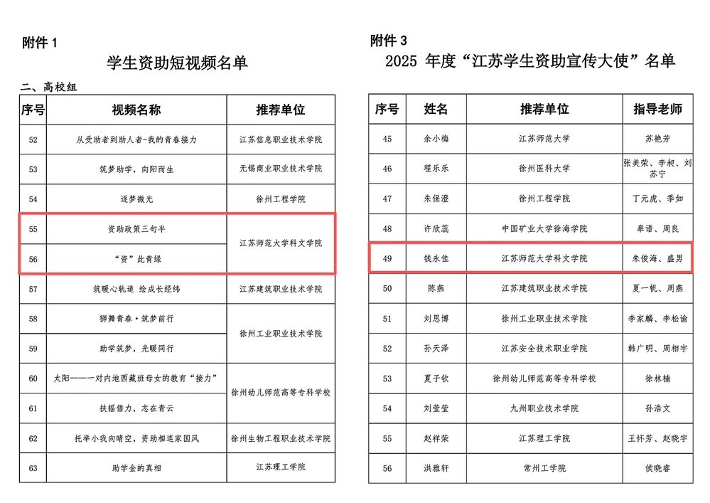 近日,江苏省教育厅公布了2025年“苏乡永助”资助育人主题活动评选结果,我院推荐的学生资助短视频《资助政策三句半》《“资”此青绿》入选优秀作品,2024级学生钱永佳获评2025年度“江苏学生资助宣传大使”。