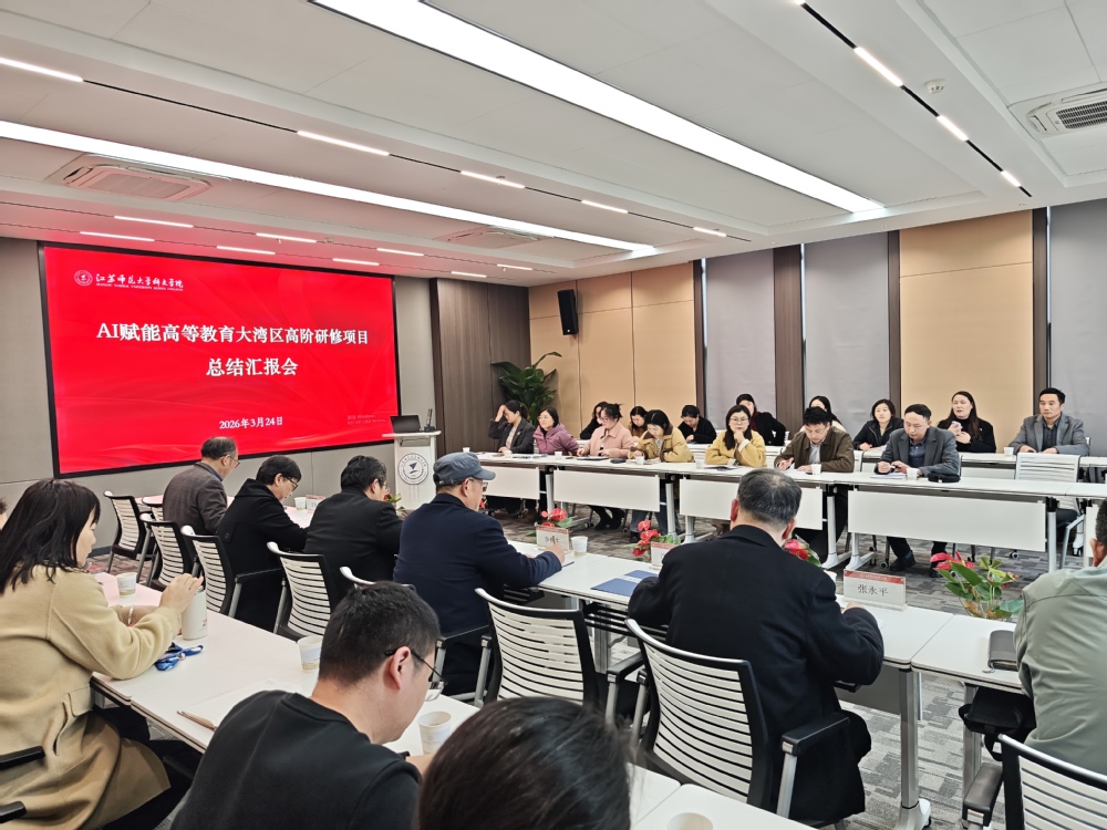 为交流学习经验,巩固学习成效,转化研修成果,3月24日下午,2026年AI赋能高等教育大湾区高阶研修项目总结汇报会在崇德楼102会议室举行。副院长张建华出席会议,教学事务部部长马先辉、副部长崔鹏飞及二级学院院长、研修教师代表参加会议。会议由崔鹏飞主持。