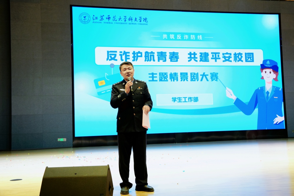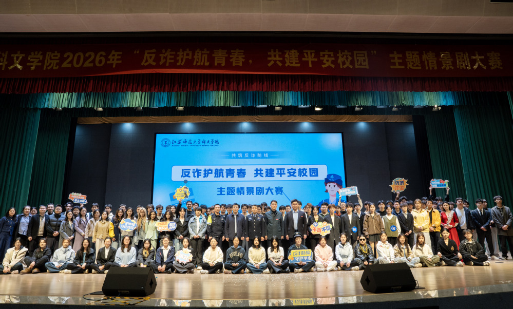 3月26日晚,学院2026年“反诈护航青春,共建平安校园”主题情景剧大赛在风华楼主报告厅举行。徐州市公安局贾汪分局副局长鲁伟,马庄派出所民警唐明天,院党委副书记、纪委书记王健,副院长王宁,学生工作部部长戚琦担任评委,各学院近千名师生到场观赛。