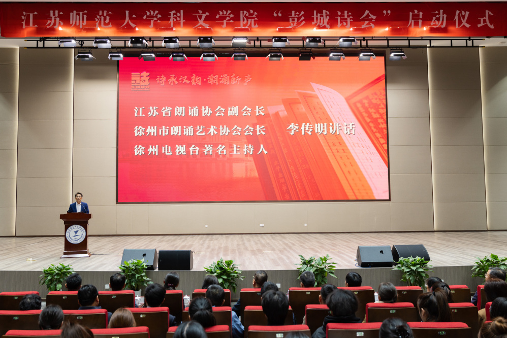 4月22日,“彭城诗会”启动仪式在学院图书馆明志报告厅隆重举行。中国语文现代化学会会长、中国传媒大学博士生导师姚喜双教授,江苏省朗诵协会副会长、徐州市朗诵艺术协会会长、徐州电视台著名主持人李传明,徐州市文化广电和旅游局二级调研员韩如海,徐州市委宣传部理论处处长李翠梅,徐州文化产业投资管理集团党支部书记、执行董事闵敏等校外嘉宾,江苏师范大学党委常委、副校长、科文学院理事长朱国军,学院全体院领导及师生代表500余人参加活动。
