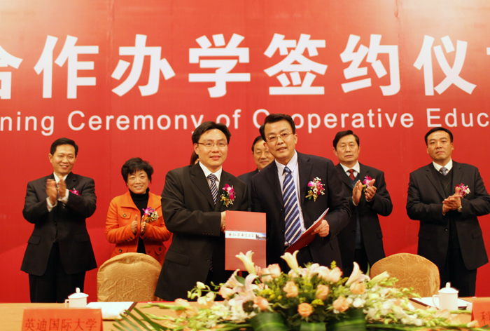 江苏师范大学副校长、科文学院董事长何保全致辞。他首先代表江苏师范大学和科文学院董事会对远道而来的英迪国际大学林校长一行表示了诚挚的欢迎,并对双方正式签约合作办学表示了热烈的祝贺。何校长指出,高等教育国际化的浪潮已成为不可阻挡的趋势,科文学院的发展,既要遵循中国高等教育规律,走独立自主办学之路;同时也要适应时代的要求,以更加广阔的视野,借鉴国外先进的教育理念,引进优质的国际教育资源,加快融入国际教育改革发展的主流中去。他强调,要通过国际优质教育资源和管理经验的共享,进一步加强科文学院的办学能力建设,在创新办学机制,深化教育教学改革、推进学科专业建设、创新人才培养模式等方面发挥积极作用。最后,他希望,双方以签约为起点,加强在更广的领域、更深层次、更高的平台务实合作,实现双赢。