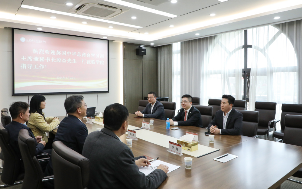 张立荣对英国中华总商会各位领导莅临学院考察交流表示热烈欢迎,并详细介绍了学院办学历史、内部治理、专业建设、师资队伍等基本情况。胡福年重点介绍了学院在国际化办学、人才培养、科研创新等方面的成果和特色,并期待通过与英国中华总商会的合作,提升学院国际化办学水平。