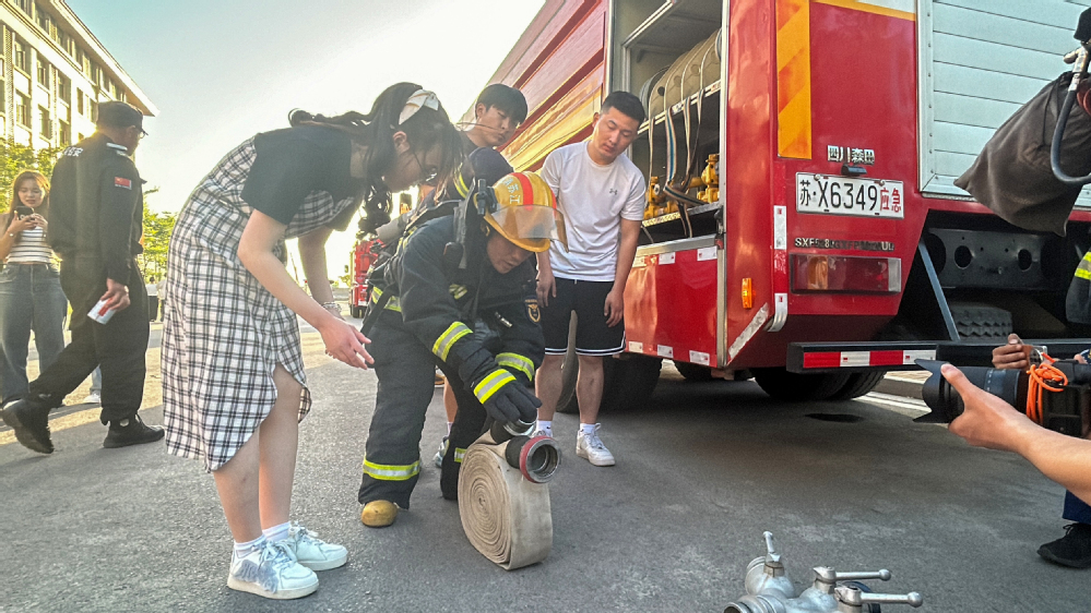 贾汪区天工路消防救援站的消防员们组织现场师生体验了消防水带铺设和消防车高压水枪操作,开展了火灾扑救演示,详细讲解了灭火器的使用方法和注意事项,并指导师生使用干粉灭火器进行火盆灭火演练。