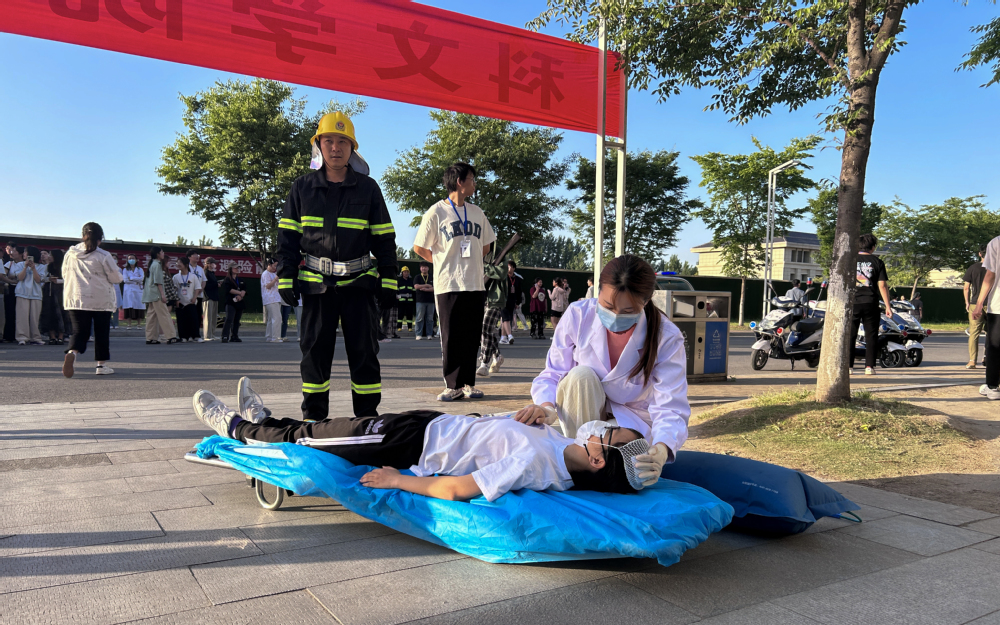 随着火警警报的响起,学生们迅速反应,在工作人员的引导下,纷纷用衣物捂住口鼻,低头弯腰,按照规定路线有序撤离。演练过程中,学生们沉着冷静,工作人员引导得当,参与演练的人员在两分钟内全部成功撤离至安全地带。同时,救援小组将伤员从火场救出,带至集合点。校医院的医护人员随即向现场集合的学生展示了伤员抢救、包扎等急救处理方法。学院消防志愿队和至善书院微型消防站志愿者第一时间赶赴火场启用室外消火栓实施灭火。消防员在现场进行了实时指导。