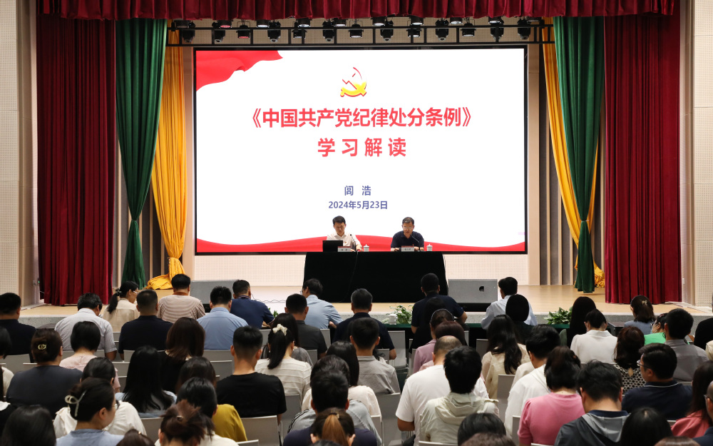 5月23日下午,学院党纪学习教育专题辅导报告会在大学生活动中心报告厅举行。校党委常委、纪委书记、省监委派驻监察专员闾浩就《中国共产党纪律处分条例》(以下简称《条例》)学习作了专题辅导报告。学院领导班子成员、教职工党员180余人参加报告会。校党委党纪学习教育专班成员、纪委监督检查处处长刘继平、组织部组织科科长酒文翀应邀参加报告会。报告会由院党委书记张立荣主持。