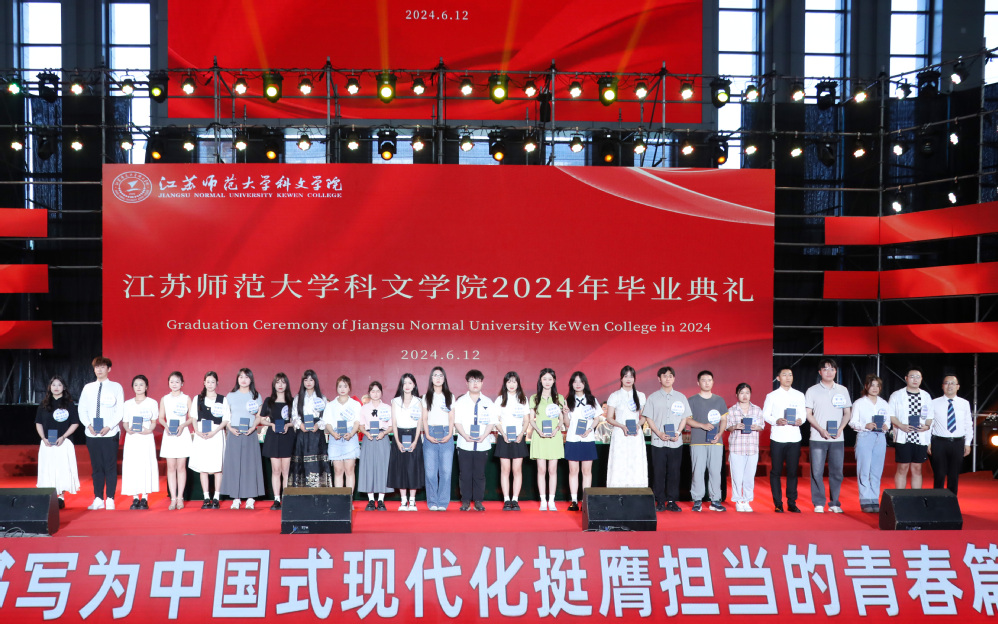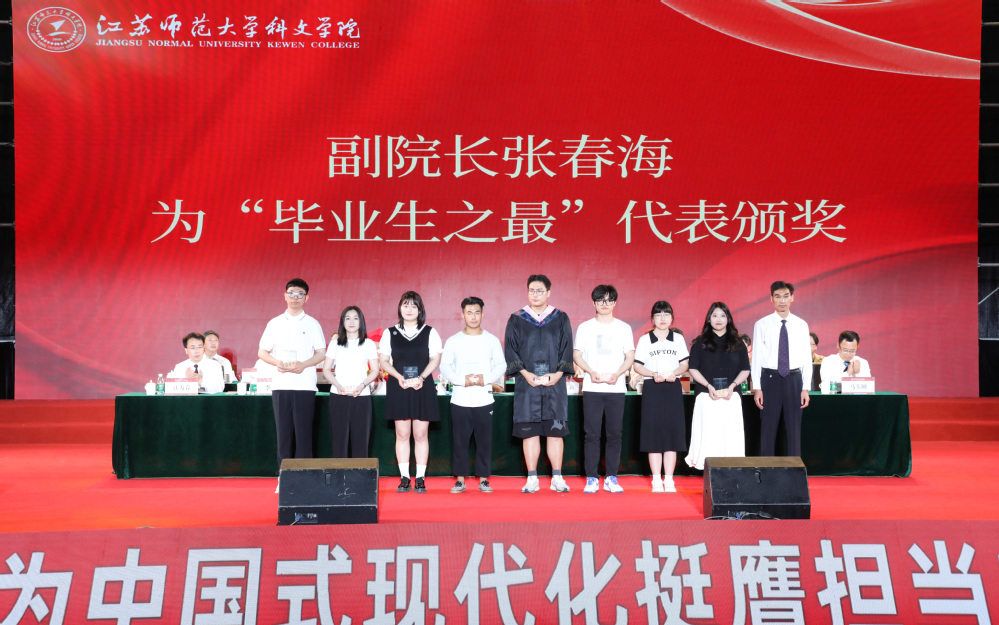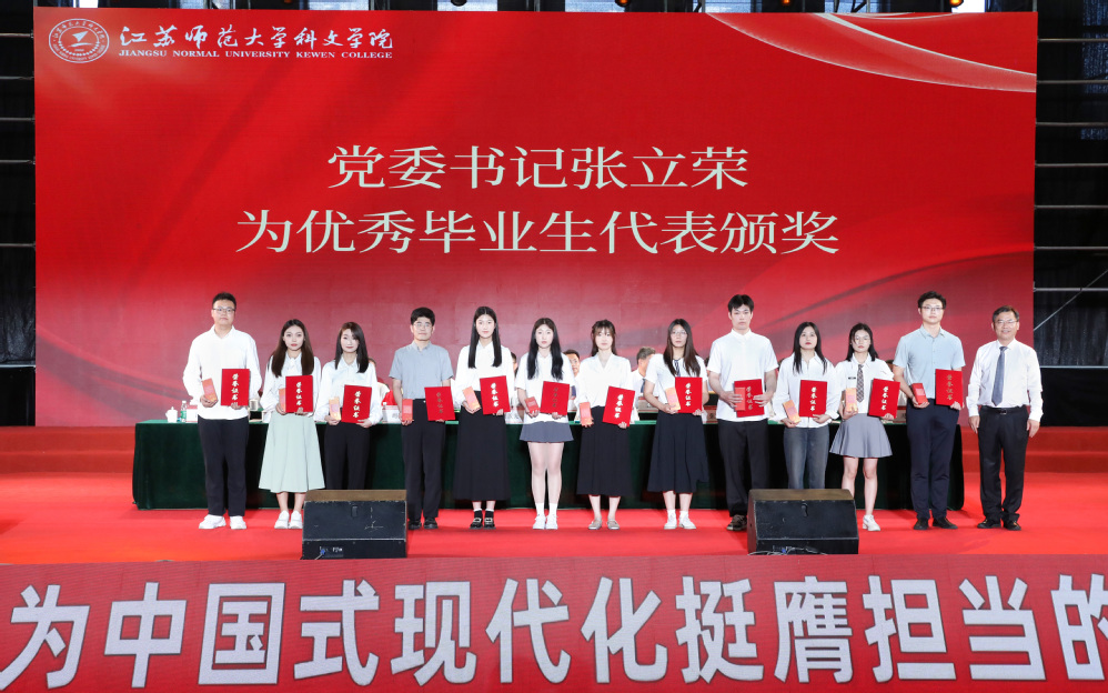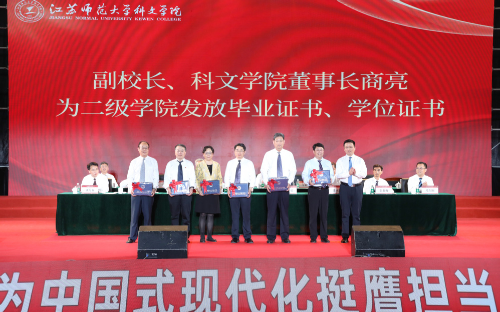 江苏师范大学副校长商亮向二级学院院长发放毕业证、学位证。在学位授予和优秀毕业生表彰决定宣读后,院长胡福年、院党委书记张立荣分别为毕业生代表拨穗正冠,向优秀毕业生代表颁奖。