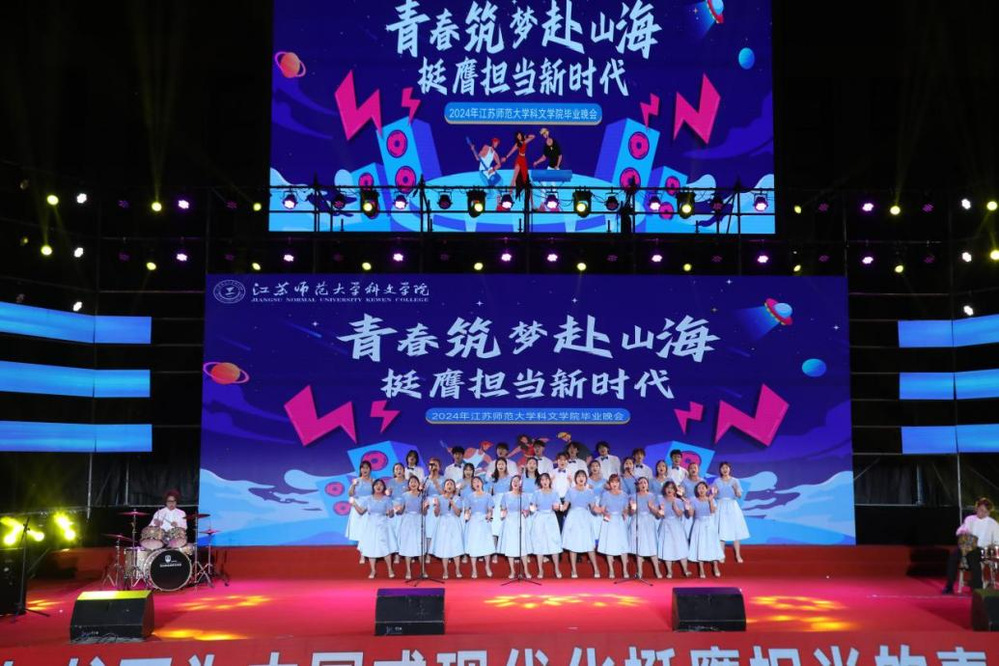 学院通过线上征集的方式,投票产生了毕业生们最想在毕业时听到的歌曲。由吴江、袁龙雨、史秋滢、盛男四位老师为毕业生们带来《七里香》《海阔天空》《凤凰花开的路口》《一路生花》,引起全场大合唱。在大学生艺术团合唱队的合唱曲目《星辰大海》的悠扬歌声中,晚会落下帷幕。