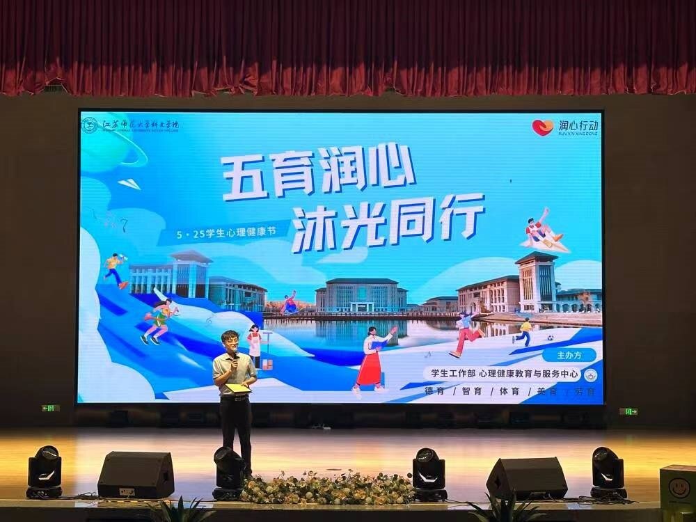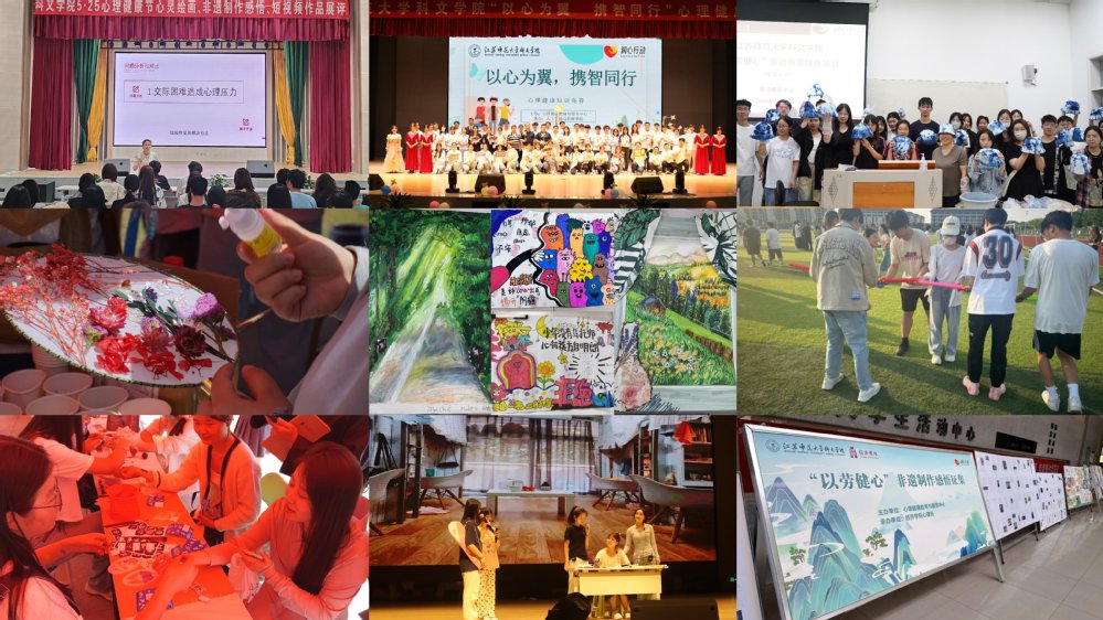 本次心理健康节活动,旨在将心理健康教育融入德智体美劳育人全过程,以互动式、体验式、浸润式教育活动,促进学生身心健康全面发展。教学事务部、学生工作部、后勤保障部、图书馆、各二级学院、四大书院联动协作,活动丰富多彩。“以德育心”活动,征集最推崇的“家训”,发挥家训文化育人功能;心理骨干评选,提升朋辈帮扶育心质效。“以智育心”活动,通过读书分享会、“为青春润心”心理学干培训、生命教育和身心疾病知识系列讲座、心理健康知识竞赛,为普及心理知识搭建平台,提升心理素养。“以体强心”活动包含心理素质团体挑战赛、足球赛、排球赛、乒乓球赛、篮球赛和体育运动短视频作品征集,充分发挥体育调节情绪、疏解压力的作用,体现了同学们追逐梦想的坚持和挑战自我的无畏。“以美润心”活动有心灵绘画比赛、“悦心”心理集市、心理情景剧大赛,通过创作美、欣赏美、分享美治愈情绪,丰富心理育人形式,实现心育与美育的融合。“以劳健心”活动,剪纸、扎染、漆扇、面塑、香包制作和非遗制作感悟征集等,吸引近千名同学参与体验,一笔一划倾诉情感,一针一线传承美好。此外,至善书院开展校地共建助农惠学活动,不仅为农户打开销路探索了新的途径,也让学生参与了一次助力乡村振兴、承担社会责任的劳动实践课。此次心理节心理情景剧大赛中的优秀剧本《与自卑共舞》,在江苏省第三届高校心理剧大赛获得沉浸式剧本二等奖。