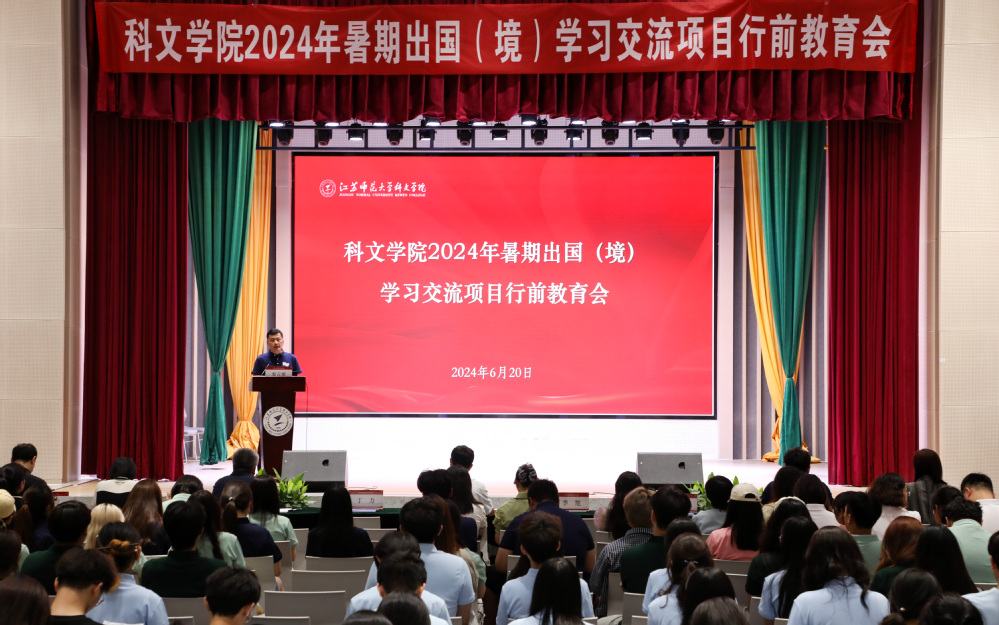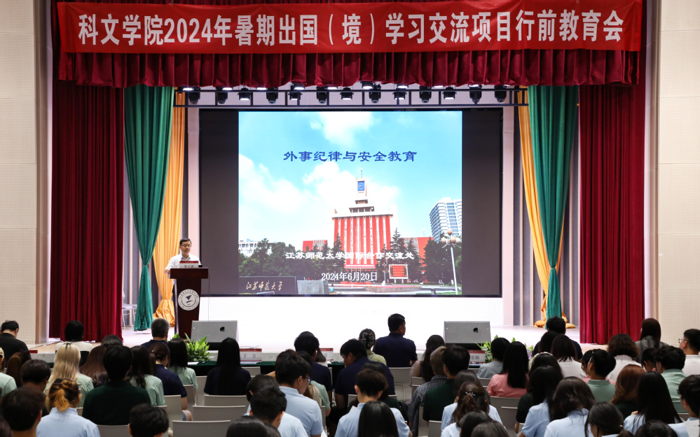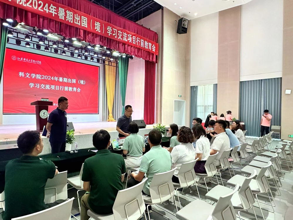 6月20日中午,学院2024年暑期出国(境)学习交流项目行前教育会在大学生活动中心报告厅举行。江苏师范大学国际合作交流处处长张蓊荟、院党委副书记丁力、副院长李旭、纪委书记马东刚出席会议,相关二级单位负责人、项目带队教师及124名学生参加会议。会议由副院长李旭主持。