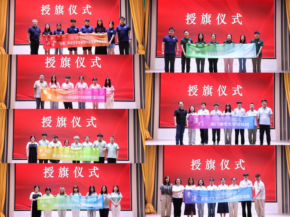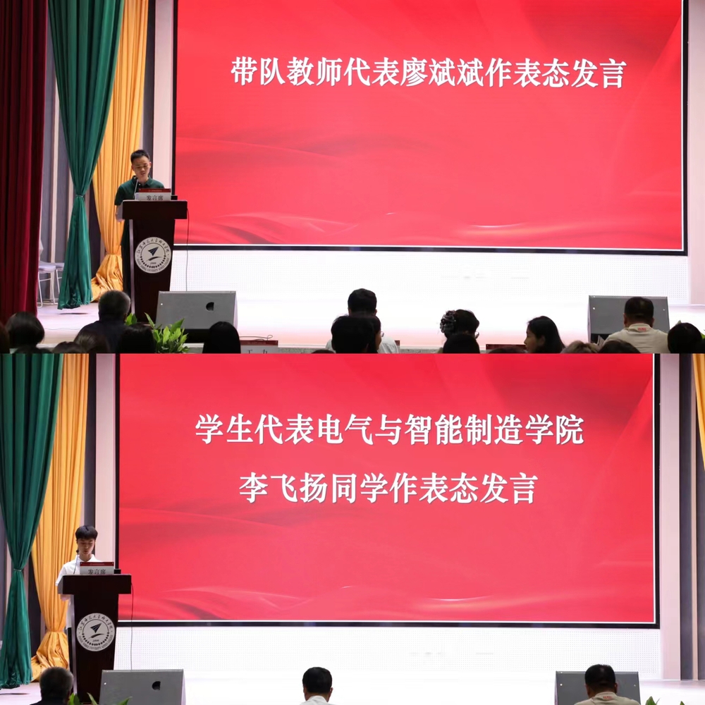 带队教师代表廖斌斌和学生代表李飞扬分别作了表态发言。随后,相关二级单位负责人依次为各团组授旗。